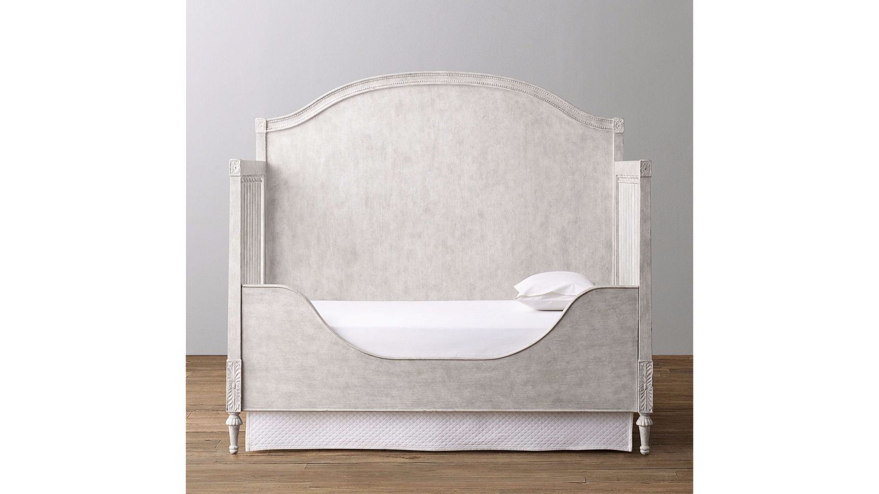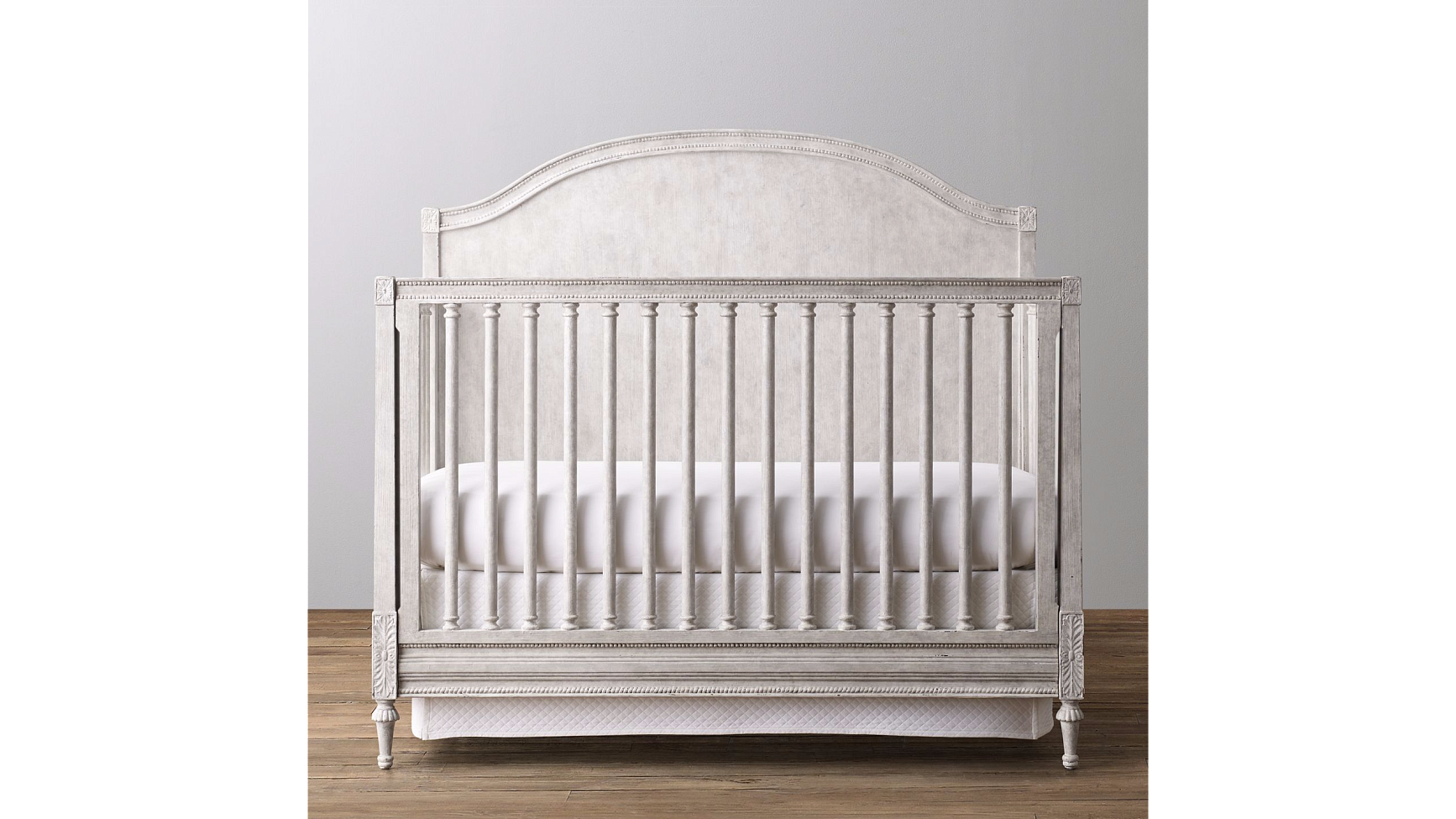Детская кроватка BELLINA ARCHED PANEL GREY от американского премиум бренда Restoration Hardware Кроватка изготовляется из твердых пород дерева, высушенных особым образом, и окрашивается вручную. Может быть выполнена в двух вариантах отделки: Heirloom White (бело-серый) или Vintage Grey (светло-серый) Изделие украшено резьбой и декором в форме цветочных орнаментов, а образ завершают изящные резные ножки. Модель кроватки может трансформироваться, и когда Ваш ребенок подрастает, передний высокий защитный бортик можно при желании заменить на более низкую и удобную панель, которая приобретается отдельно. Высота дна кроватки, на которое укладывается матрас, регулируется на 3 уровня: 46 см, 38 см и 27 см (высота над полом) Размеры: Общие размеры: длина - 140 см, ширина - 79 см, высота - 130 см. Высота решетчатого бортика - 97 см. Высота свободного пространства под кроваткой - 13 см. Вес - 64 кг. Размер съемной передней панели: ширина - 131 см, глубина - 4 см, высота - 42 см. Вес - 8 кг.