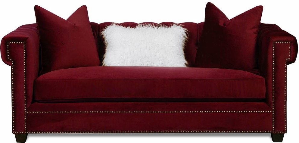 Трехместный диван ADDISON от премиального американского бренда Aria Designs. Оформлен велюровой обивочной тканью насыщенного винного оттенка. Внутренняя поверхность декорирована утяжкой и мебельными пуговицами. Фронтальная сторона акцентирована мебельными гвоздями оттенка античной бронзы. Подлокотники квадратной формы находятся на одном уровне со спинкой. Ножки черные из массива древесины, окрашены в черный цвет.