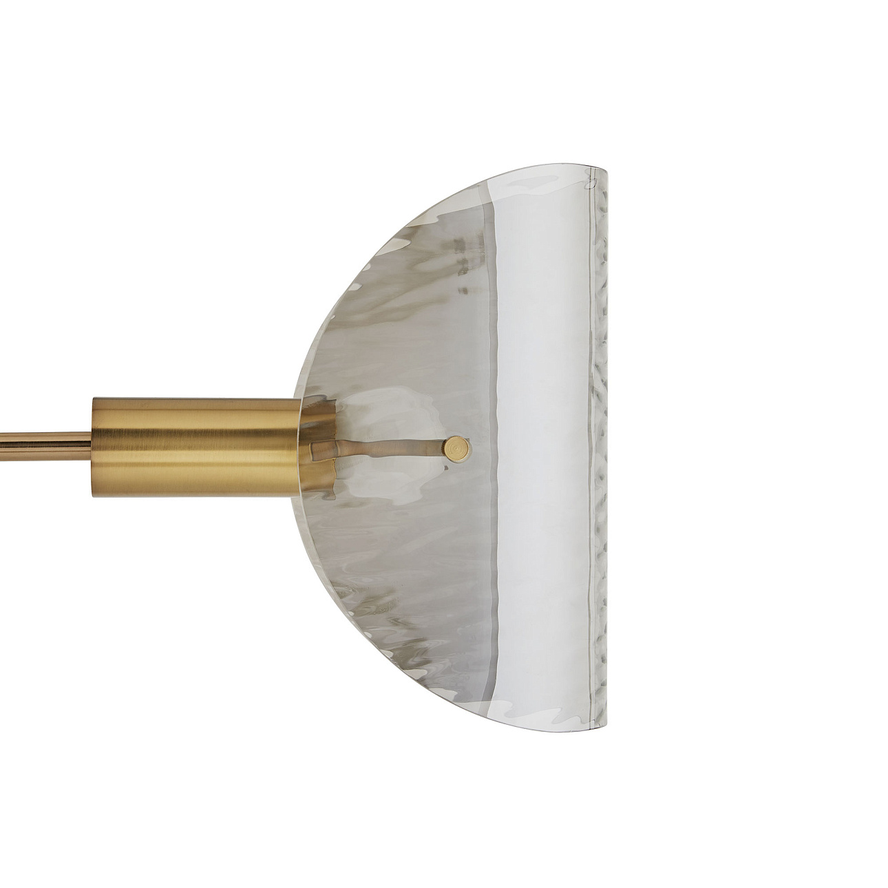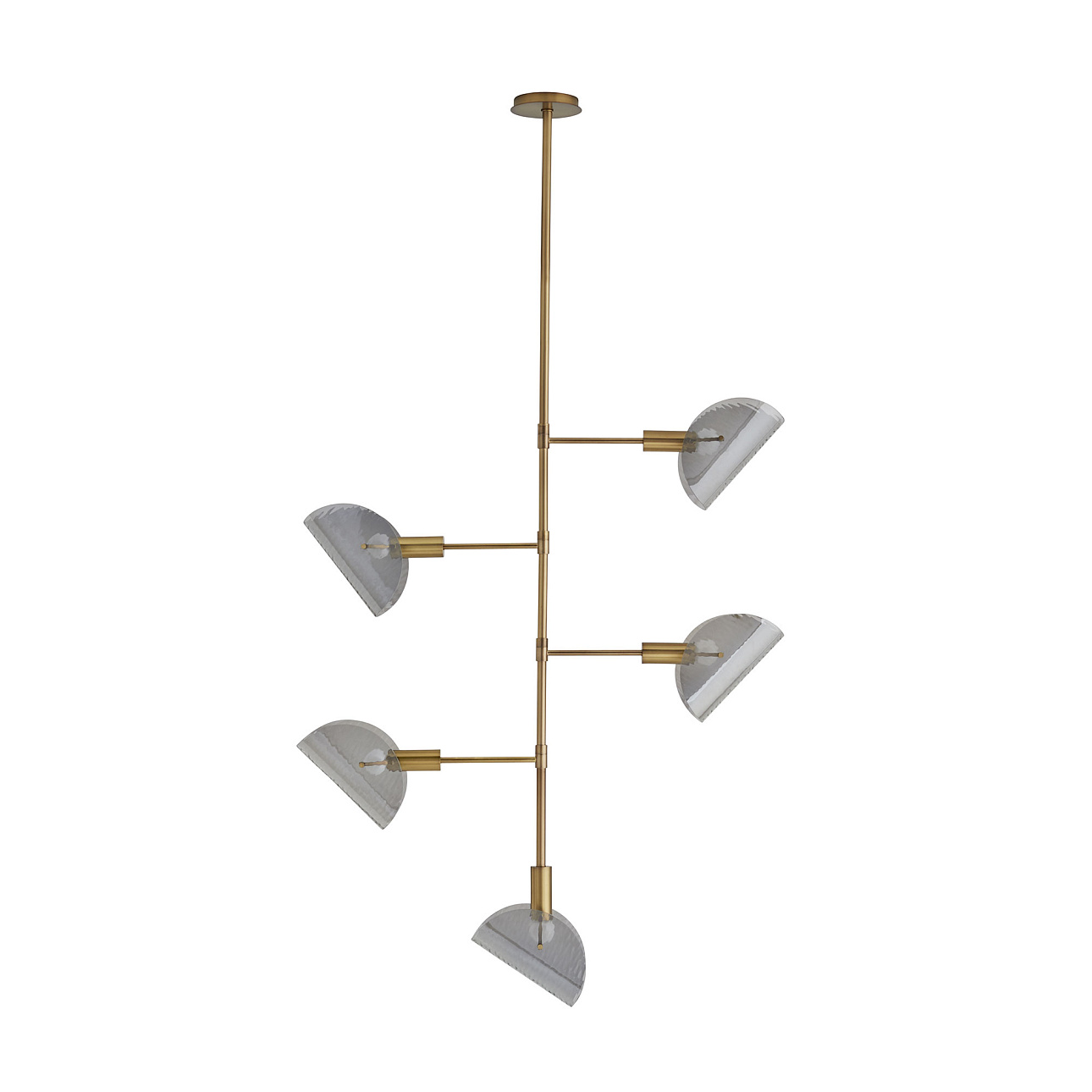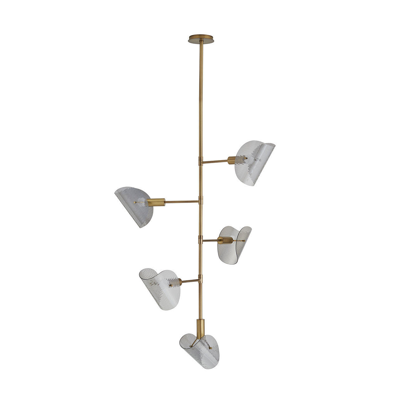 Люстра Bend от премиального американского бренда Arteriors изготавливается из металла в отделке античная латунь. Плафоны регулируются под углом и выполнены из дымчатого текстурированного стекла. Светильник работает от 5 лампочек с цоколем Е26.
